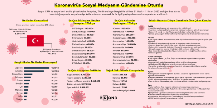 Sosyal CRM ve sosyal veri analizi şirketi şirketi Adba Analytics, The Brand Age Dergisi ile birlikte 21 Ocak – 11 Mart 2020 aralığını baz alarak hazırladığı raporda, sosyal medya kullanıcılarının koronavirüs ile ilgili paylaşımlarını ve konuşmalarını analiz etti.